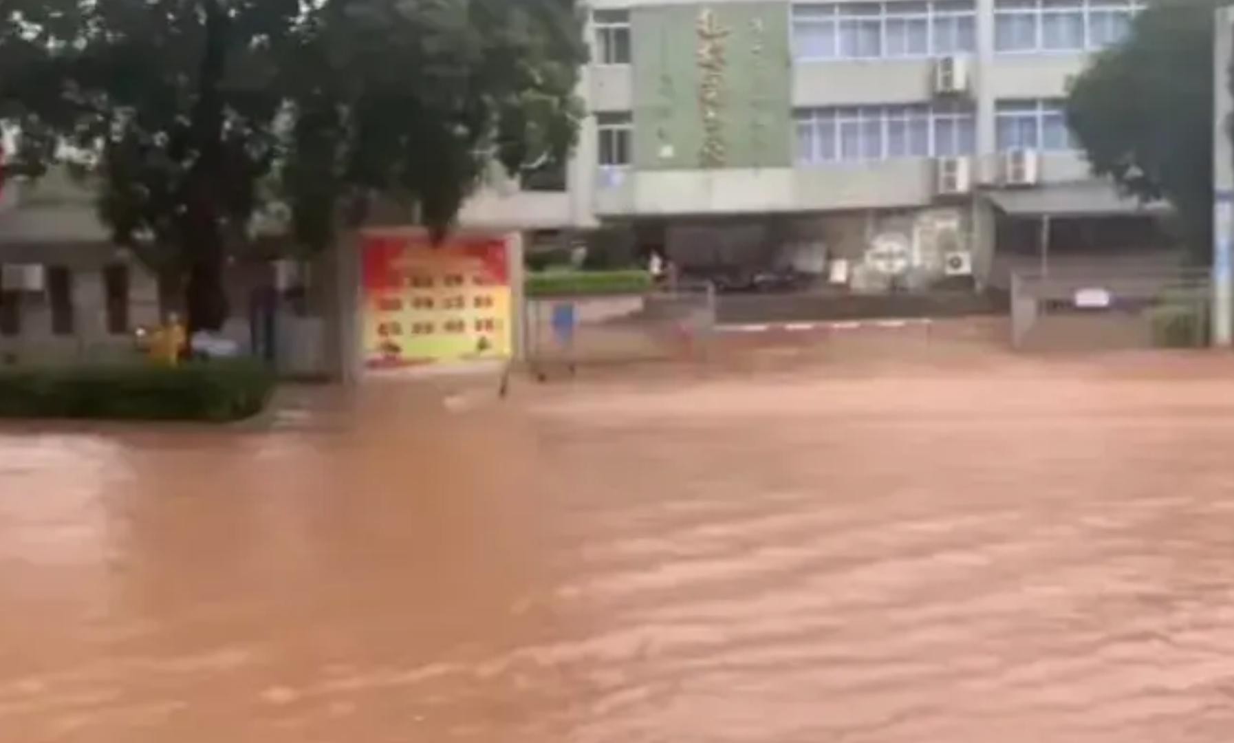 更有网友晒出火车站附近的街头景象,只见水位已经淹到了小轿车的车轮位置,路牌几乎淹没大半个身子,路边行道树也“泡”在了水中。不少市民在路上摸索回家的路,但由于路面积水较深,只能“硬着头皮”往前走。市区因受连绵不断的暴雨影响,多地出现了内涝及城镇积水等现象。有网友晒出当地街头巷尾及小区门口的照片显示,不少路段和小区门口都被淹没在水中,甚是吓人。