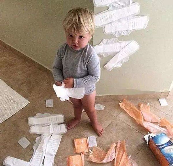 第四张图:妈妈刚买的卫生巾,成了孩子最佳的玩具