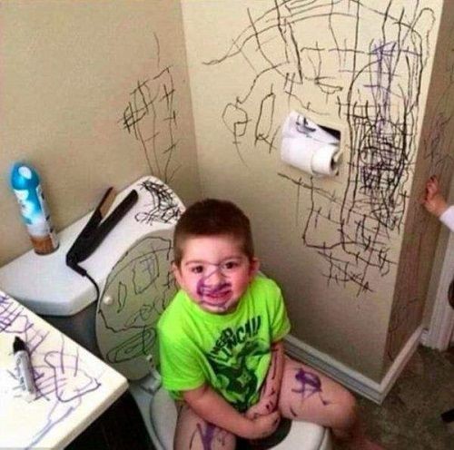 第二张图:就上个厕所的功夫,厕所的墙上就成了画板,而自己的衣服和脸上都是。