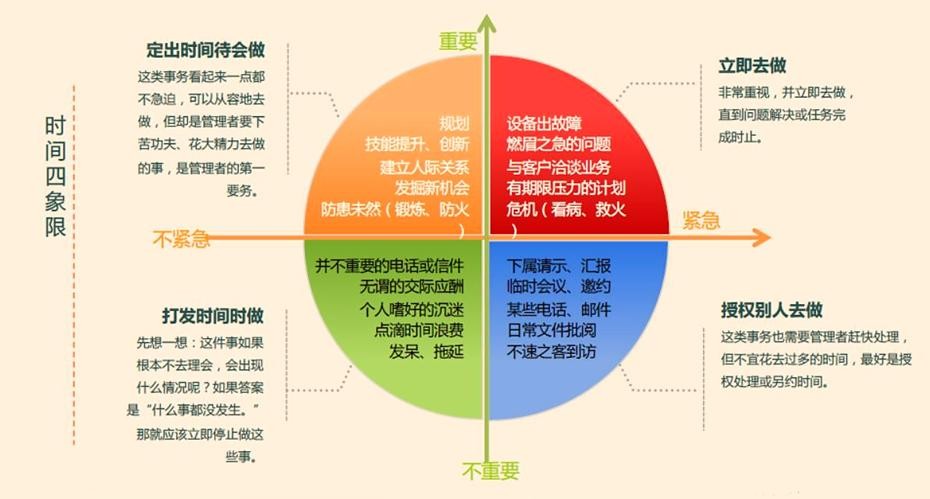 推荐大家看一下《高效能人士的七个习惯》这本书,书中提到了一个习惯:【要事第一】,其实就是在讲如何管理时间,那如何才能做到【要事第一】呢?当然首先就是要区分什么是【要事】,因为我们都知道什么是【第一】。