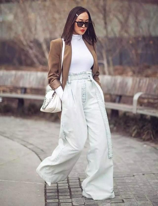 漂白高腰牛仔裤搭配白色上衣是不会出错的,休闲随性又显高挑。