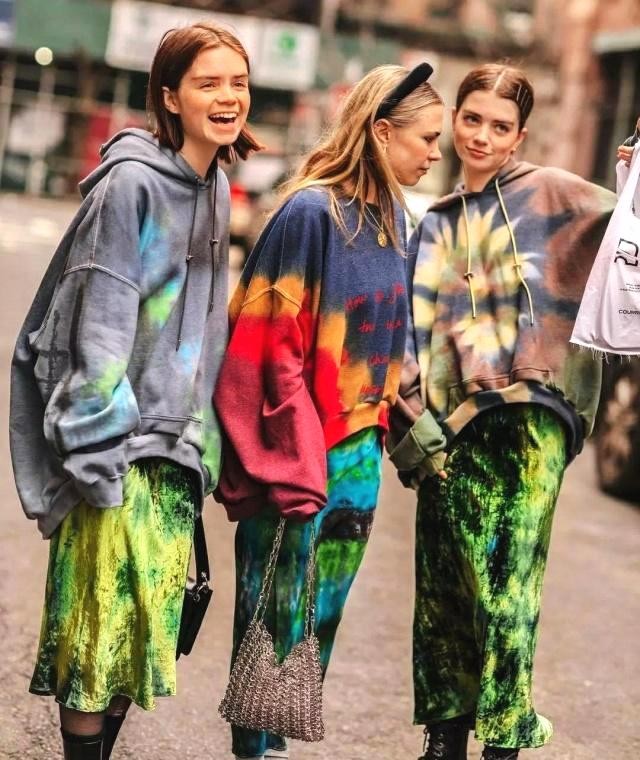 挑选一款适合自己的扎染单品非常的酷,特别是扎染卫衣和半裙搭配展现了青春朝气的活力,潮流人士的时髦搭配。