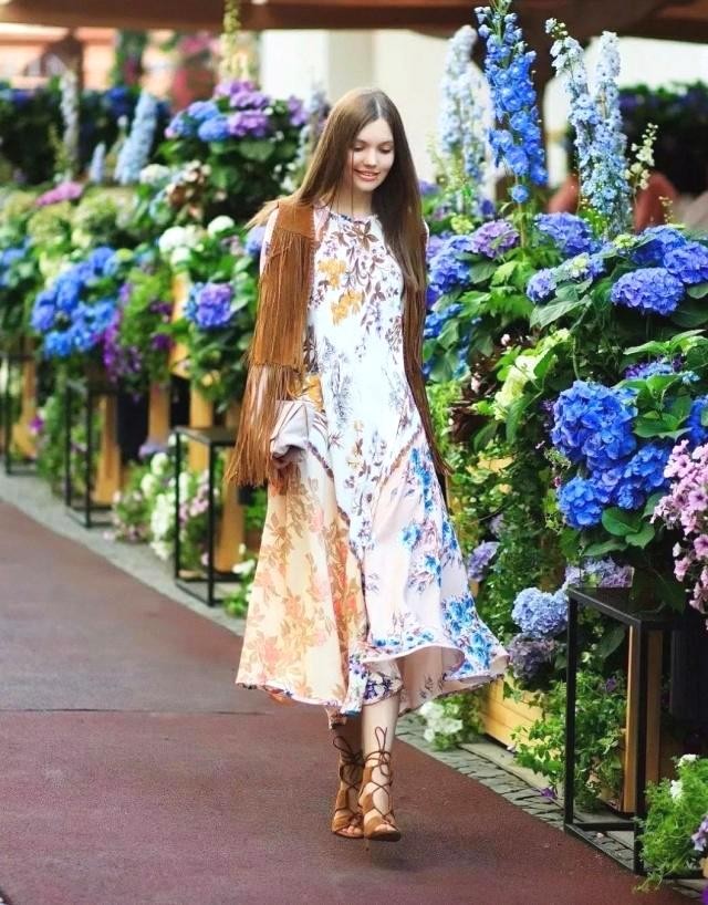 印花连衣裙搭配流苏马甲怎么那么好看,显高显瘦又时尚。