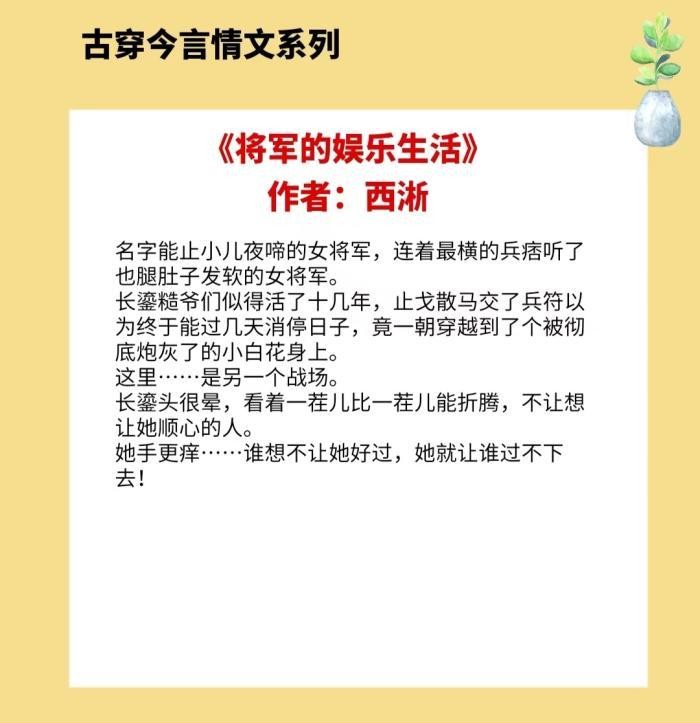 短评:古穿今 娱乐圈 女强 甜宠,古代女将军穿越现代闯娱乐圈的故事,苏苏苏。 女主原来是将军,魂穿到现代,武功智商超群,过目不忘,帅裂苍穹。外表美丽、内心女强、行为女汉子,还喜欢撩妹,被誉为“国民老公”,男主原来花花公子,喜欢上女主后变成痴情小娇妻,貌美骚包又傲娇,人称“孔雀先生”。男女主性格互补,极其反差萌。女主一路金手指,非正统娱乐圈奋斗文,不喜慎入!