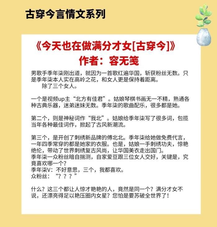 短评:古穿今,男主高岭之花歌手,女主御绣房宫女穿越到现代大二孤儿,金手指大开,有三个马甲,一路虐渣,走上人生巅峰,无烦人的男女配,没有家庭阻挠,双处。琴棋书画舞样样精通的古代才女在现代直播吸粉,当然容貌是在线的,绣艺更是顶尖绝技;师长宠爱、朋友崇拜、大众追捧,当然还有吸引男主,披着马甲的女主角不管几次元都能够收服一大批忠粉,最终成为新一代的女神。金手指超大,苏苏苏,无脑文,虽然要苏破天际了,但是看得超爽啊!