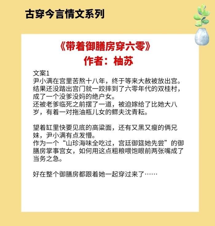短评:穿越、古穿今、年代文,成熟稳重军人X反穿善良军嫂女主,女主御膳房掌事宫女,穿越到六十年代刚与男主结婚的孤女,还随身带着一个可以连接御膳房的空间。在日常相处中,男主发现女主的各种优点,大方善解人意,厨艺特别好。每天回家有热饭热菜,孩子们也都懂事可爱,男主主动表白也融化了女主,她也想要平淡美好的生活。老公负责颜值高,孩子也听话聪明。而且随身空间和可以沟通前世徒弟的御膳房,攒物资,养孩子,度过动乱年月。家长里短,细水长流,值得推荐!