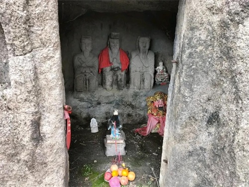 看到了简朴的三清、天地水三府之官殿,是石刻的,仍旧供有水果,和香火。看来经常有人前来朝拜。
