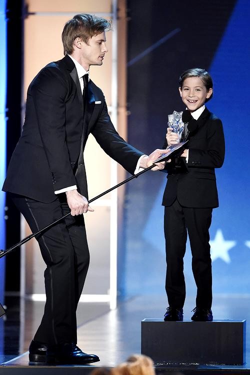 第87届美国国家评论协会奖颁奖仪式上,《梅林传奇》主演布莱德利·詹姆斯为雅各布举话筒