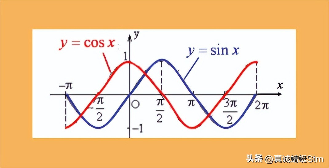 再继续看,正弦函数过了波峰开始下降,在(x=π)的时候,它的切线斜率是负的,而此时余弦函数y=cos x在此处的值也是负的。