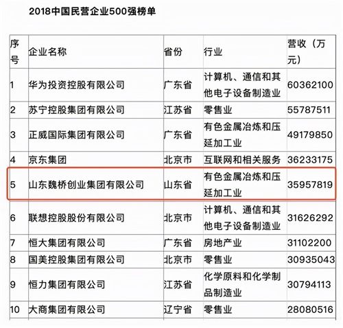 他名下的魏桥集团,所知者更是寥寥无几,却不知魏桥曾在2018年碾压联想、恒大,登上民营企业500强的第五位。