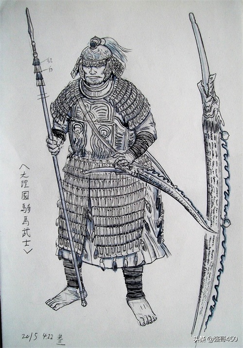 大理国的武士形象,皮甲、和放竹木弓的龙形弓韬