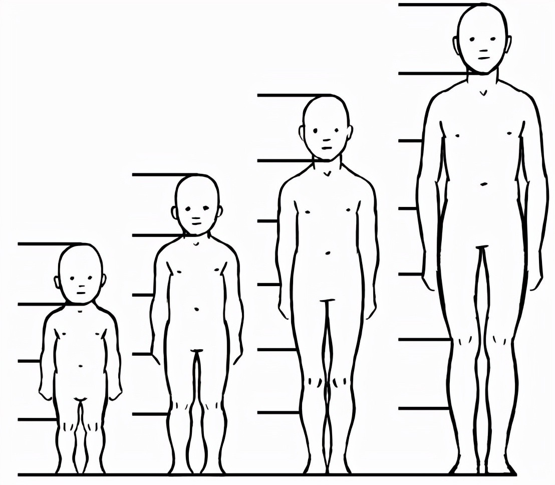 无论1个人身高多高,他的身体比例都有规律可循,根据年龄,我们把身体分成以下模块。