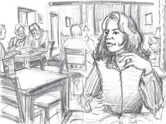 咖啡屋里的人物,把周围环境画在随身素描本的对称页上。