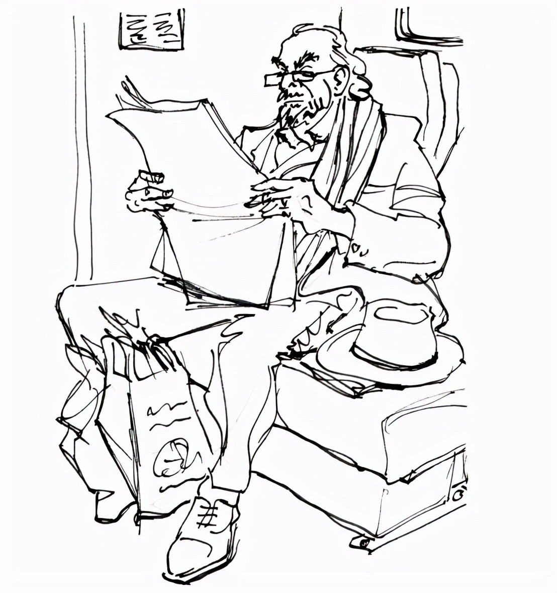 埋头看报纸的人物,仅需几笔就可以表现出人物坐在火车的座椅上。