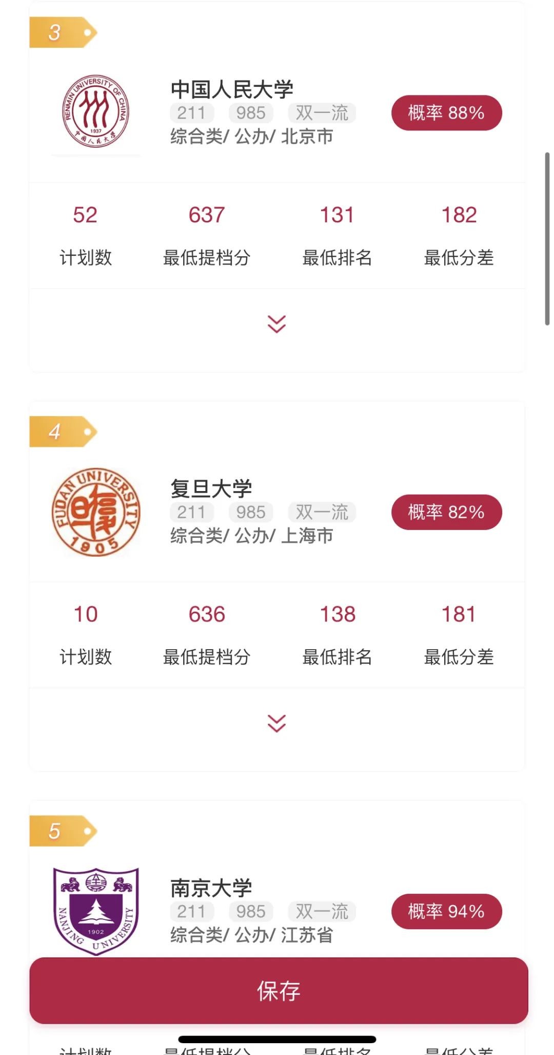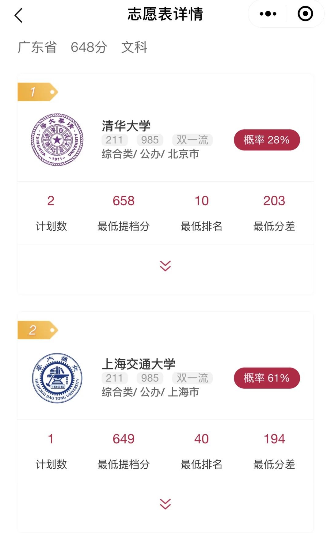 平台根据你的条件需求,为你推荐与分数相匹配的大学、专业及各个学校和专业录取概率的优质方案,院校和专业自动排序, 智能一键生成个性化方案。