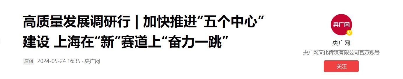 信源:《高质量发展调研行 | 加快推进“五个中心”建设 上海在“新”赛道上“奋力一跳”》——央广网 2024-05-24