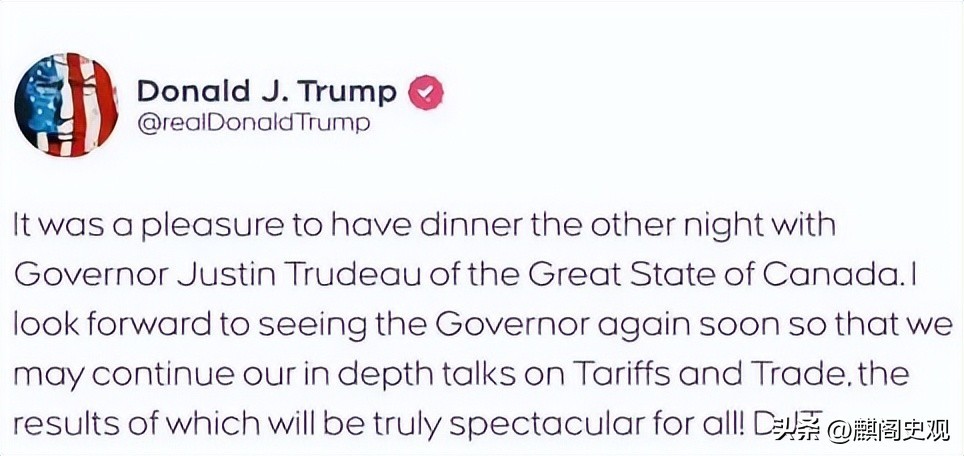 特朗普在社交媒体上不止一次称呼加拿大总统为“加拿大州长”,比如在12月10日,他在社交媒体上就曾发布这样的内容。