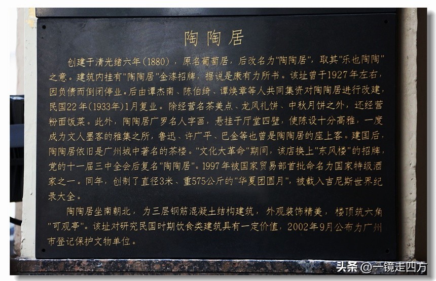 关于陶陶居的创办时间,有一说是清光绪六年,也就是1880年,还有一说是1893年,无论确切时间如何,这家老字号的经营已经超过130年。据说创办者叫黄澄波,他的妻子名葡萄,便以叫“葡萄居”为字号,1927年,茶楼大王谭杰接手,扩大了经营规模,新股东嫌“葡萄居”名称不雅,又从一间茶室买来了“陶陶居”的匾额,寓意来此品茗“乐陶陶”。陶陶居主营茶点、月饼、菜肴,其中,月饼制作特别出名,被誉为“月饼泰斗”,1993年被国内贸易部授予“中华老字号”称号,1998年经国内贸易局批准为“国家特级酒家”。