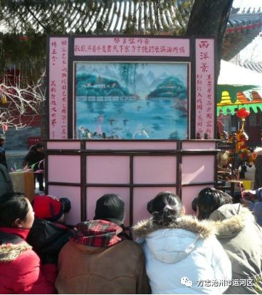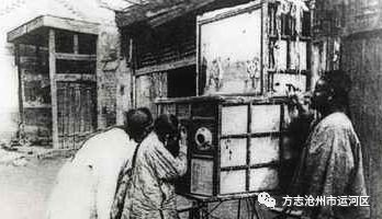 拉洋片是一种中国传统的民间艺术,亦叫“西洋景”、“拉大画”、“拉大片”,是京城老天桥撂地表演的一种民间杂耍,被称为“天桥八大怪”之一。表演者通常为一人。使用的道具为四周安装有镜头的木箱。箱内装备数张图片,并使用灯具照明。表演时表演者在箱外拉动拉绳,操作图片的卷动。观者通过镜头观察到画面的变化。通常内置的图片是完整的故事或者相关的内容。表演者同时配以演唱,解释图片的内容。