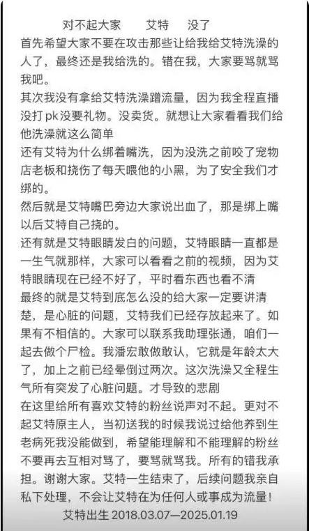 后来,潘宏在自己的账号上发布长文,告知大家艾特已经死亡,之后凌晨4点他又在直播中解释艾特年纪大了,心脏不好,是突发心梗离世,承认带艾特洗澡这个决定是错误的。他表示艾特的原主人已经将尸体带走,准备进行检查,如果有任何问题,他愿意承担责任。