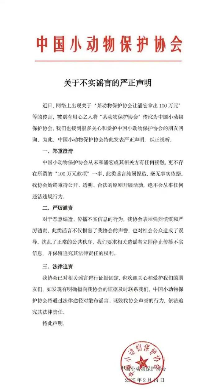 潘宏在该视频中还称:曾有自称“动物保护协会”的人给他打过电话,要求他拿100万元,可以“帮忙摆平”。不过,潘宏的这番话很快就被中国小动物保护协会“打脸了”,发声明表示从未和潘宏或其相关方有任何接触,更不存在所谓的“100万元款项”一事。