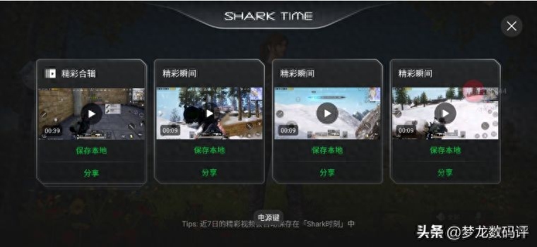 4、SHARK TIME,智能记录对局中的精彩瞬间,自动生成视频集锦。这个功能类似于王者荣耀自带的王者时刻功能,但是不同的是这是黑鲨手机独家功能不仅支持王者荣耀也支持刺激战场。玩一盘吃鸡之后能够回看所有的击杀录像感觉那是相当帅,还能分享给朋友得瑟哈。