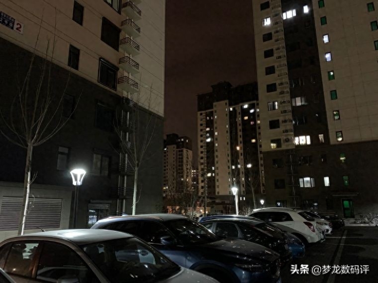 晚上也延续了白天的情况,画面亮度和解析力都比iPhone XS MAX差。比如稍远点的车牌和楼上牌子都已经看不清了。