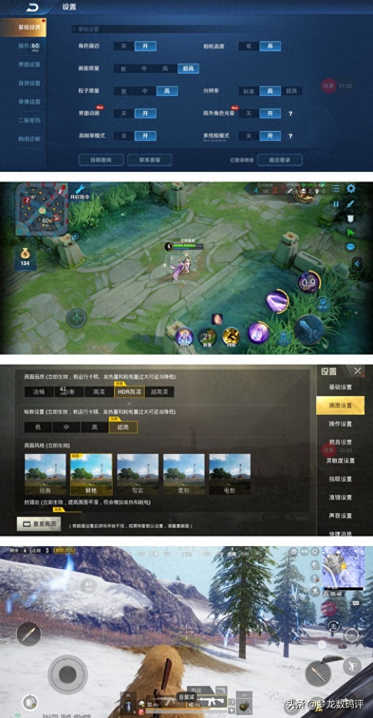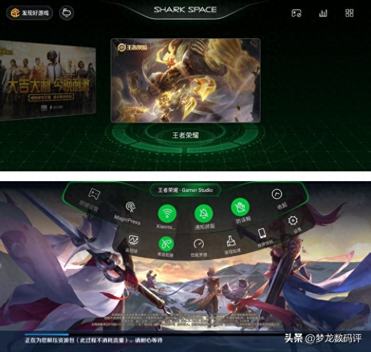 2、双区域压感触控,屏幕左右能独立设置压感操作,在SHARK SPACE的下拉菜单中可以开启。通过自定义实现王者荣耀里的左屏压感开地图、右屏压感买装备,相当于不增加外设的前提下就增加了物理按键。当然更多游戏的设置方式都可以自己发掘,可玩性很高。