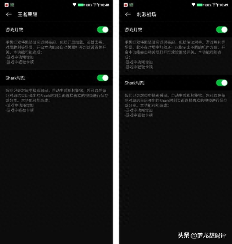 3、通过设置背面黑鲨Logo会随着游戏时呈呼吸灯效果。边框两侧的氛围灯也可以针对不同游戏实时亮起,比如王者荣耀的开局加载、英雄击杀,这点比爱酷手机那个需要4杀才亮就要亲民多了。