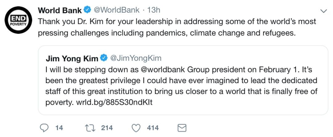 据路透社,世行行长金墉当地时间7日突然宣布辞职,2月1日起正式生效。世行随后发布声明,确认金墉将离职的消息,但声明并未给出金墉辞职的具体原因。
