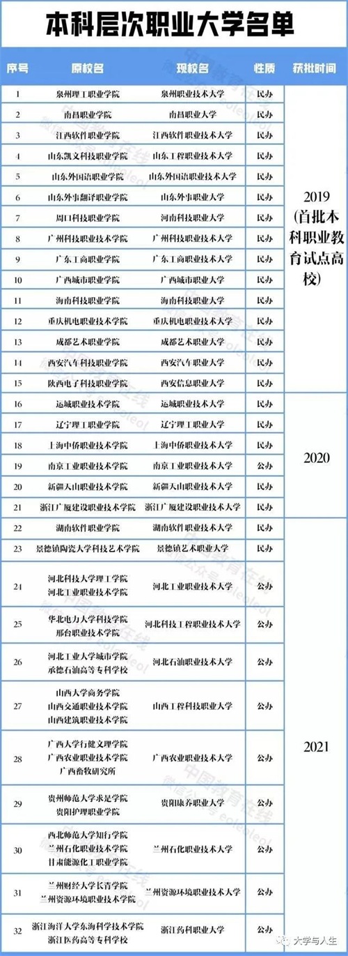 2019年以来,教育部只批准了32所职业技术大学(有的叫“XX职业大学”)开展试点,未来估计会大量增加。高等职业院校称谓想变更为“大学”主要途径包括:一是高等专科职业院校独立升格为大学,比如南京工业职业技术大学。二是本科独立学院+高等专科职业院校合并组建,比如河北石油职业技术大学等;三是本科独立学院主动转型,比如景德镇艺术职业大学;四是本科独立学院+高等专科学校合并组建,比如浙江药科职业大学。很多民办职业大学其实实力一般,主要是为了试点,获取经验。考生报考时要认真甄别。