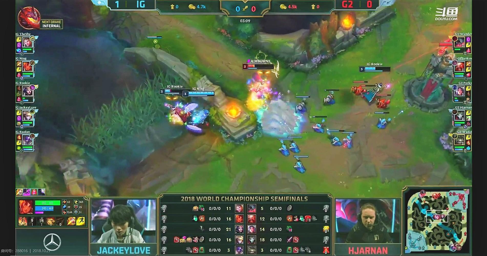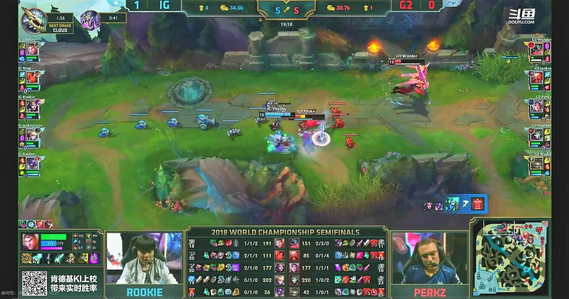 3分,中路两强交出了火花,但perkz有些上头,被反蹲的IG打野宁蹲到,perkz交出一血,一血仍然给rookie拿到。