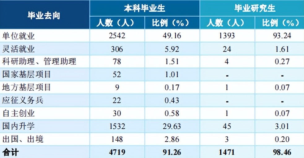 其中本 科毕业生、毕业研究生的毕业去向落实率分别为 91.26%、98.46%。