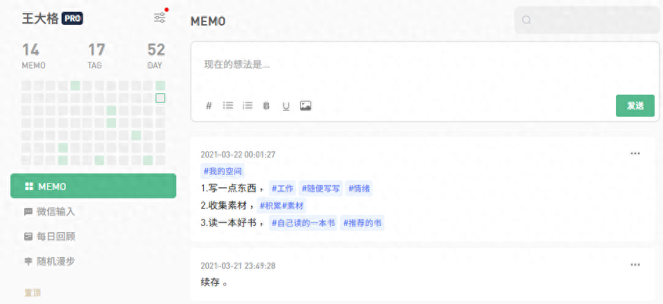还有flomo,可以说是一个加强版的文件传输助手,平是脑袋里突然冒出一些想法,如果你不记录,第二天就可能忘记了,这个时候你就可以截止打开微信通过服务号直接输入就杏,还可以打标签,需要的时候可以通过搜索寻找或者标签寻找就可以了。